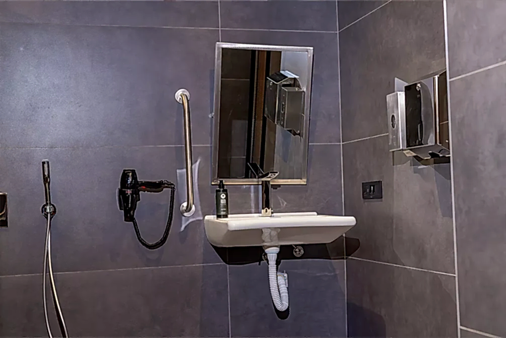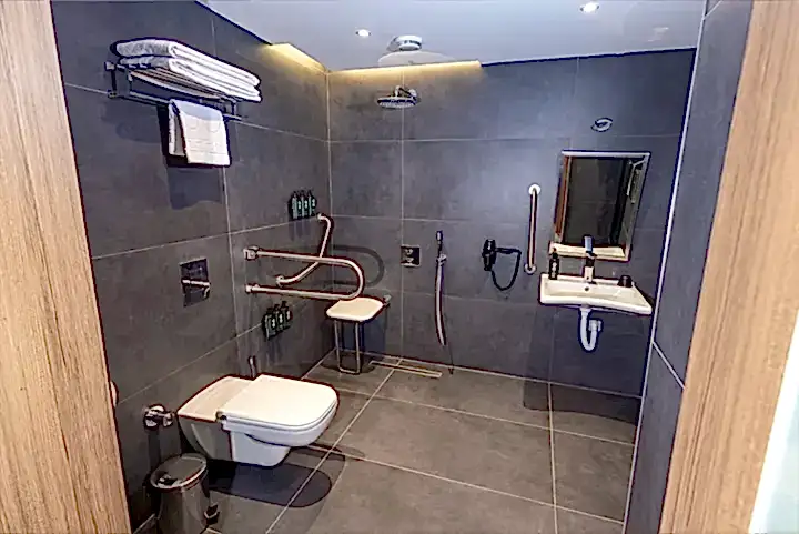 Engelli odası banyosu, tekerlekli sandalye erişimine uygun lavabo, geniş duş alanı, güvenli tutunma barları ve acil çağrı butonu gibi özelliklerle donatılmıştır. Engelli dostu oda, her detayı düşünülerek hazırlanmış olup, konforlu ve keyifli bir konaklama deneyimi sunar.